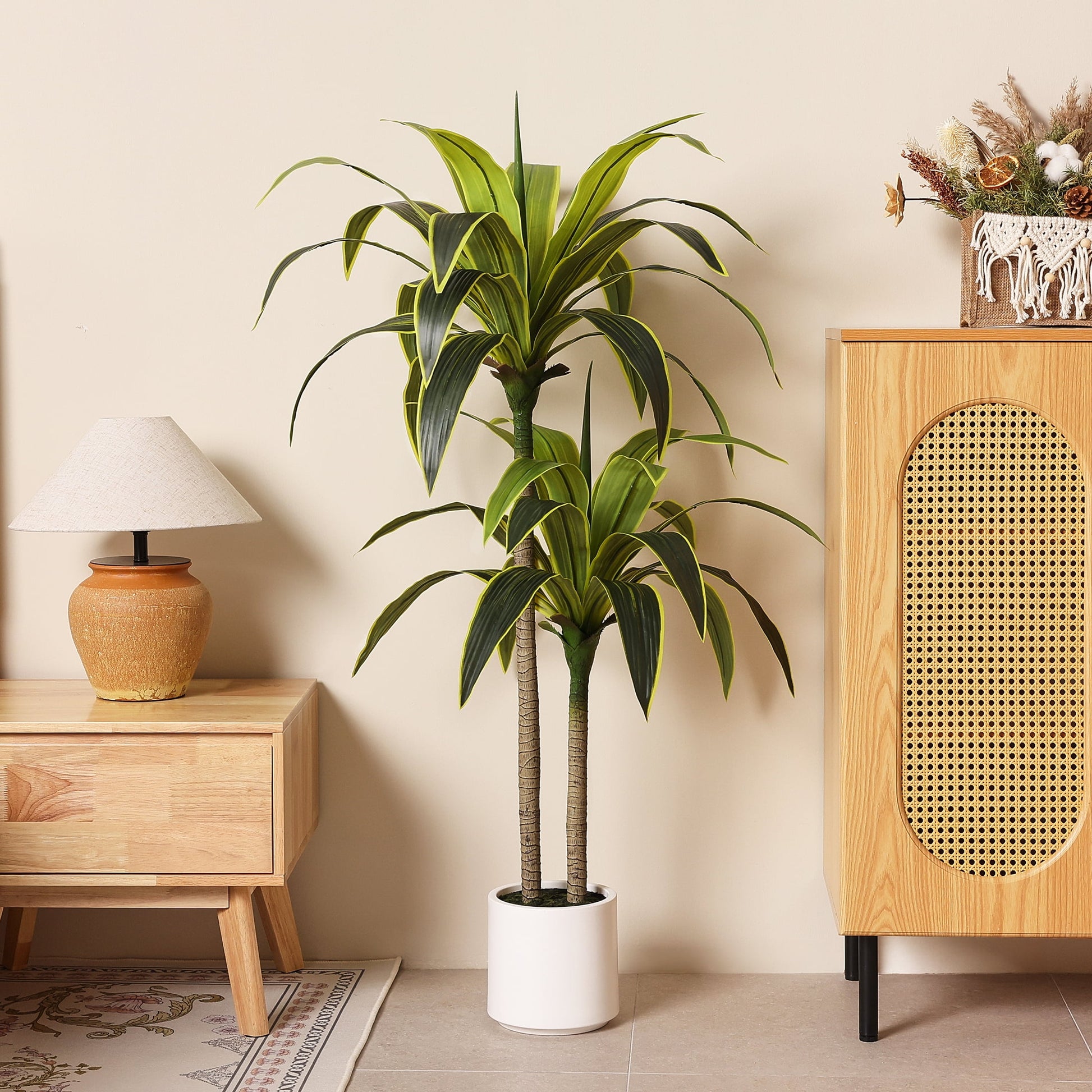 Introduce the vibrant, tropical elegance of a Dracaena to your interior d¨¦cor with the DR.Planzen 4.5ft Artificial Tree. This expertly crafted faux plant captures the essence of the real thing with its lush, green leaves featuring authentic-looking variegation and natural growth patterns. Housed in a sleek white planter, it stands as a full and vibrant statement piece that brings life and a modern botanical touch to any space. Perfect for adding a pop of color and style to your home or office, it offers all the beauty of nature with absolutely none of the upkeep.