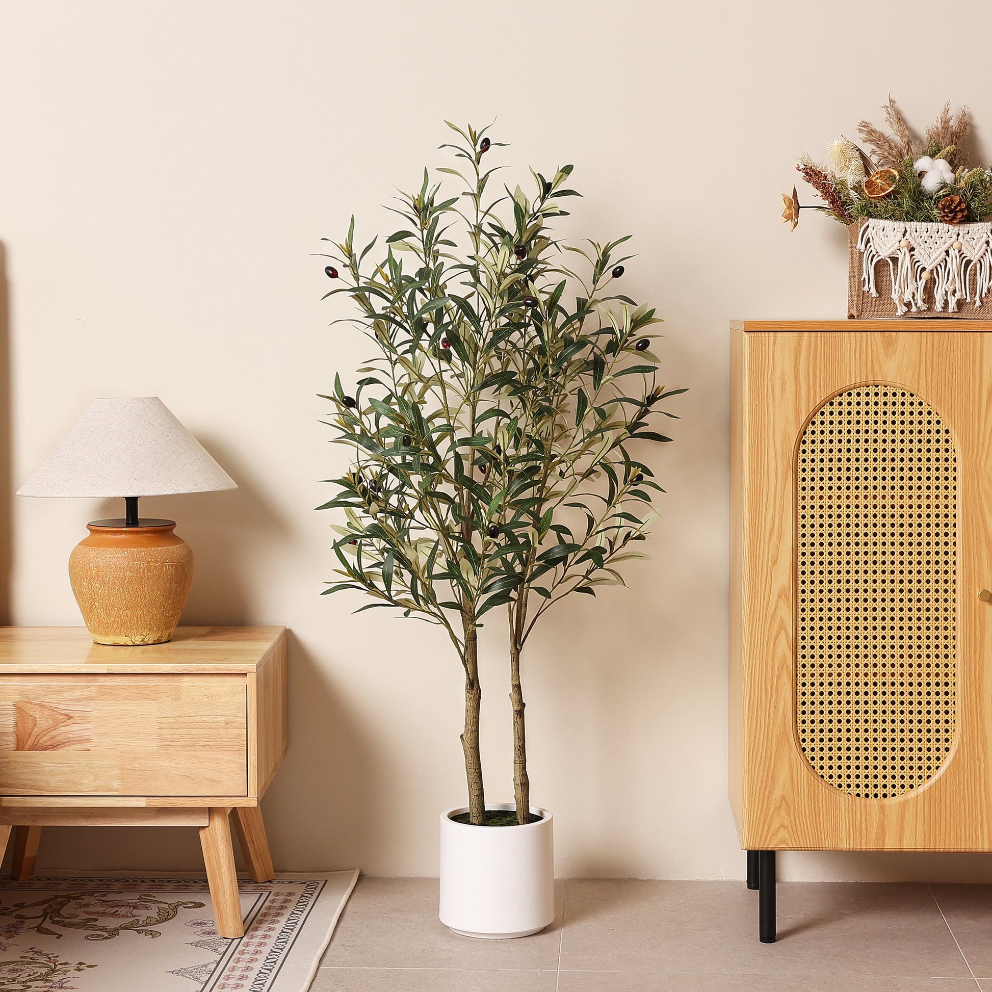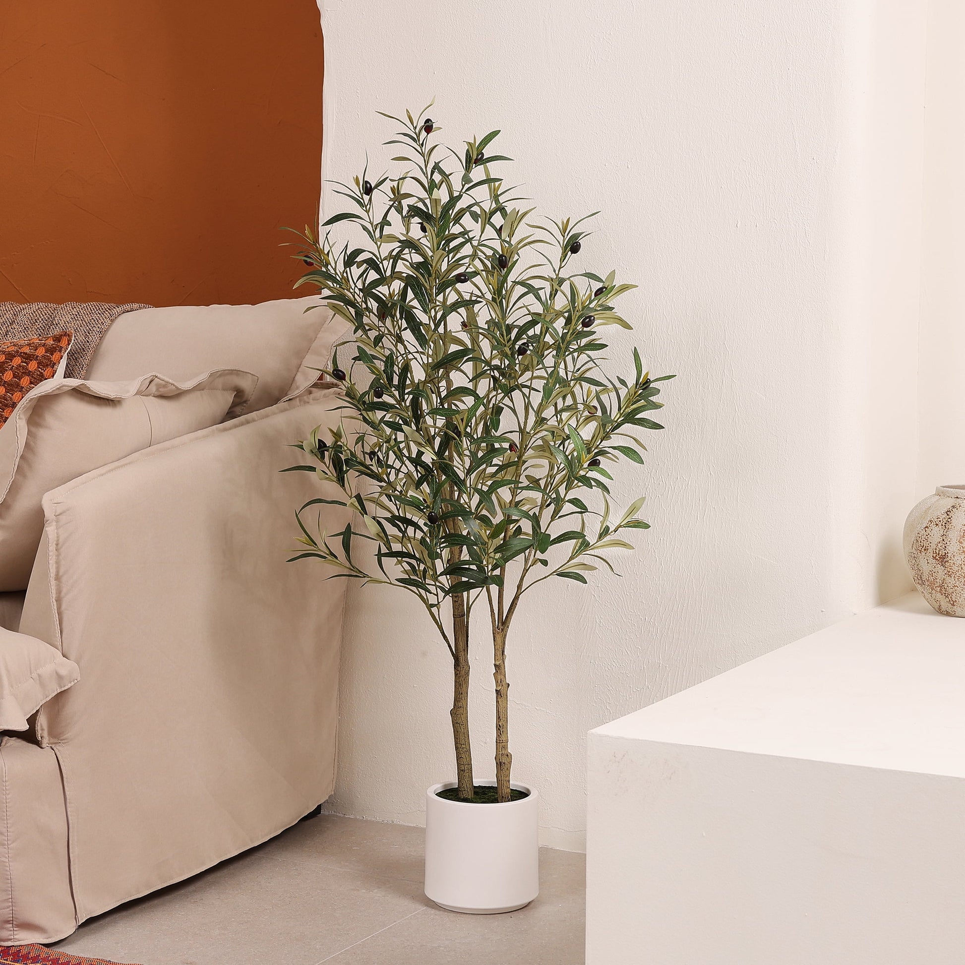 Elevate your interior d¨¦cor with the DR.Planzen 4.5ft Artificial Olive Tree. This stunning faux tree brings the timeless beauty and serene elegance of the Mediterranean into your home or office without any maintenance. Crafted with meticulous attention to detail, it features lifelike leaves and realistic olives for an authentic look. Nestled in a modern white planter, it's the perfect statement piece to add a touch of natural sophistication to any room, from living areas and bedrooms to reception spaces and studios.